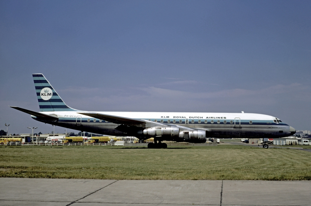KLM have had 16 DC-8 series 50. This series was in fact a DC-8-33 with the new P&W JT3D-3 turbofans. These new engines were more economical wich resulted in an increase of 15% of the range and a considerable noise-reduction. The PH-DCU is a DC-8-55CF(Convertible Freighter) suitable for freight and/or passanger services. The PH-DCU came into service in Febraury 1966 and sold in July 1983 to United Air Leasing, USA. During this period it have had three different liveries.