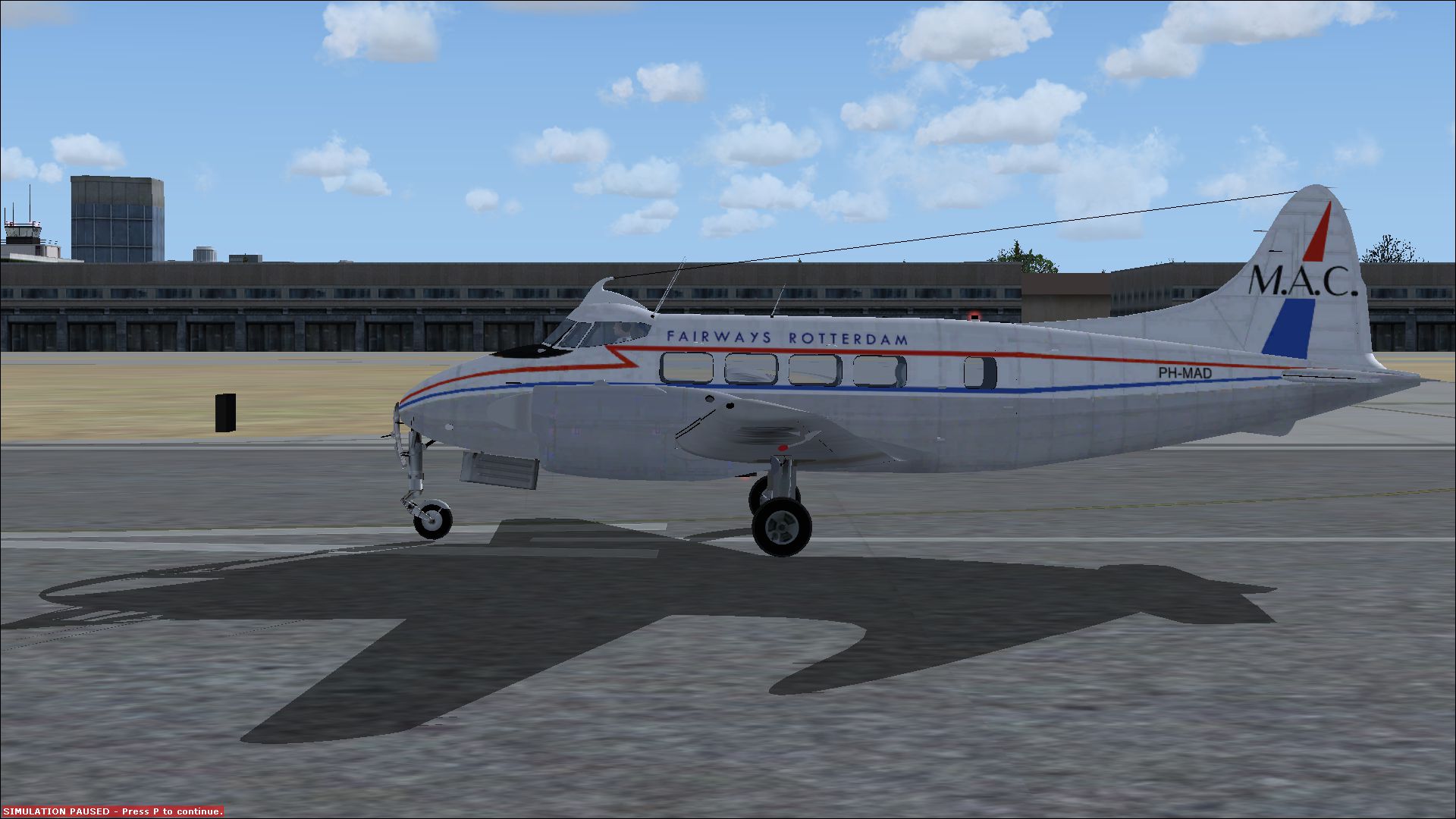 The PH-MAD was the first Dove owned by Martin's Air Charter. In March 1960 it was painted in the similar livery as that of the from Alitalia bought DC-3. From 1961 till 1964 it got a new MAC-livery. In 1964 MAC bought Fairways Rotterdam. MAC needed the Fairways C-47A's urgently for its charterflights.The PH-MAD replaced the C-47A on the line Rotterdam-Southampton with the name "Fairways Rotterdam" instead of "Martin's Air Charter Ltd" on the fuselage. End 1964 however one stopped the service and the plane was painted again in the newest MAC-levery and mainly used for pleasure-flights over Amsterdam. After that sold to the UK.