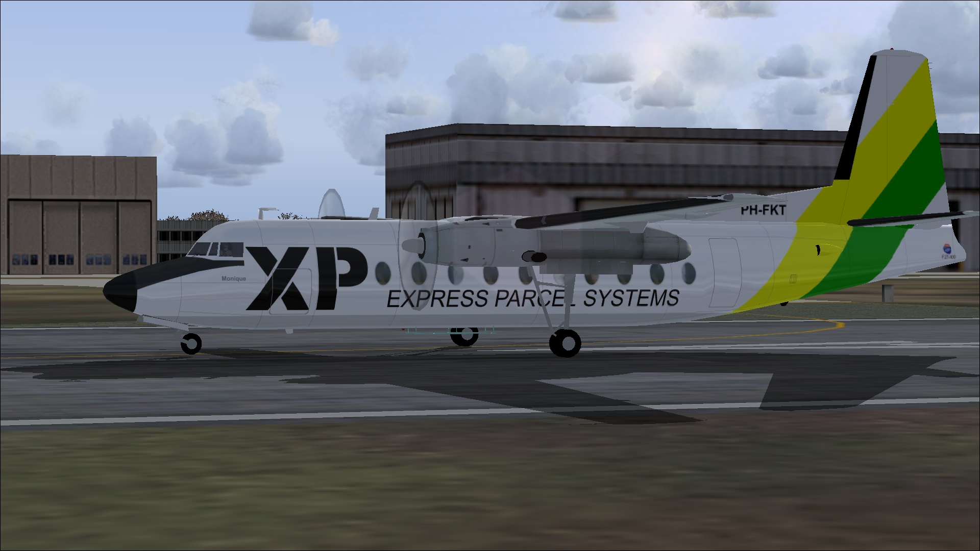 XP Express Parcel Systems was founded in 1972 as City Courier by a few Amsterdam students who provided fast courier services within the capital on bicycles and motorcycles. The American courier company Purolator bought the company and after a few years sold it to the Dutch Vendex International, which changed the name City Courier to XP Express Parcel Systems. XP subsequently became a subsidiary of KLM Cargo. After a few years, KLM no longer considered courier services as its core business and sold XP to Global Distribution Express World Wide, jointly owned by the Australian TNT and the postal services of the Netherlands, Sweden, Canada, France and Germany. Today, TNT is part of FedEx Corporation. XP Express Parcel Systems operated its own Fokker F.27 Friendship-fleet. Additional capacity was leased from numerous European companies. For the long-term contracts, these leased aircraft were painted in XP's livery but remained registered in the country of origin. This repaint is an item within the download: Fokker F 27-100, 200, 400 Dutch Pack for FS2004 and FSX