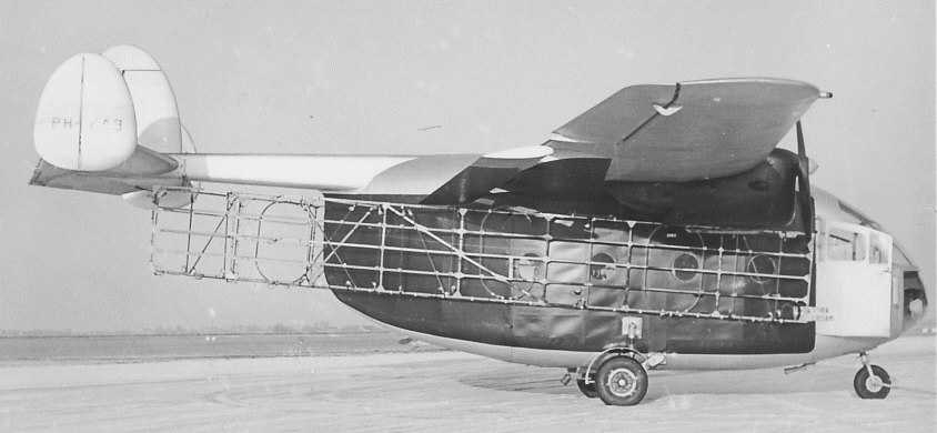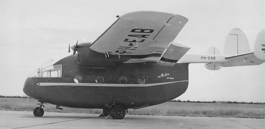 The Miles M-57 Aerovan was a short range, low-cost transporter. From 1946 till 1947 Miles built 52 examples, mainly used for freight, joy-riding and passenger services. One example was owned by Nastra Luchtreclame Services in Rotterdam and used for aerial advertising and joy-riding. In March 1959 they bought the Miles M.47 Aerovan G-AHXH, ex Island Air Charters , Jersey from Air Contractors and registered as PH-EAB. The owner of Nastra had seen an Aerovan in the UK mounted with frames on both sides of the plane. With neon letters on those frames a brandname( usually a cigarette brand) could be seen during the twilight houres. Unfortunately, the Nastra Aerovan was severely damaged during a storm in 1961 and was subsequently scrapped.The later succesful Short Aerovan was based on the Miles Aerovan with a high-aspect wing of Hurel-Dubois.