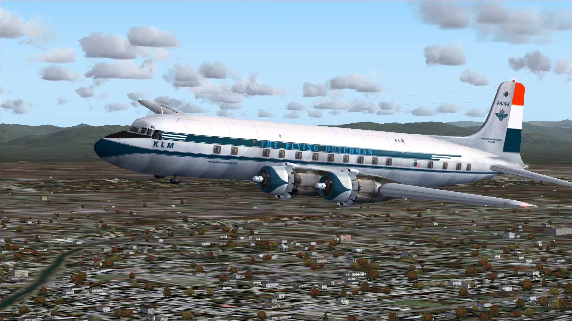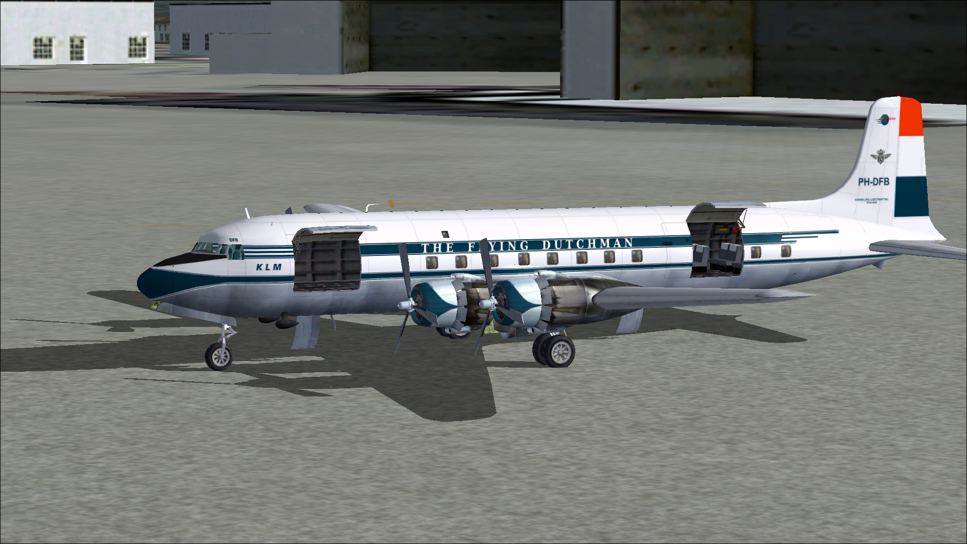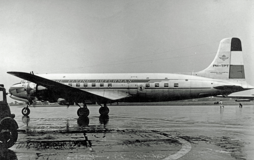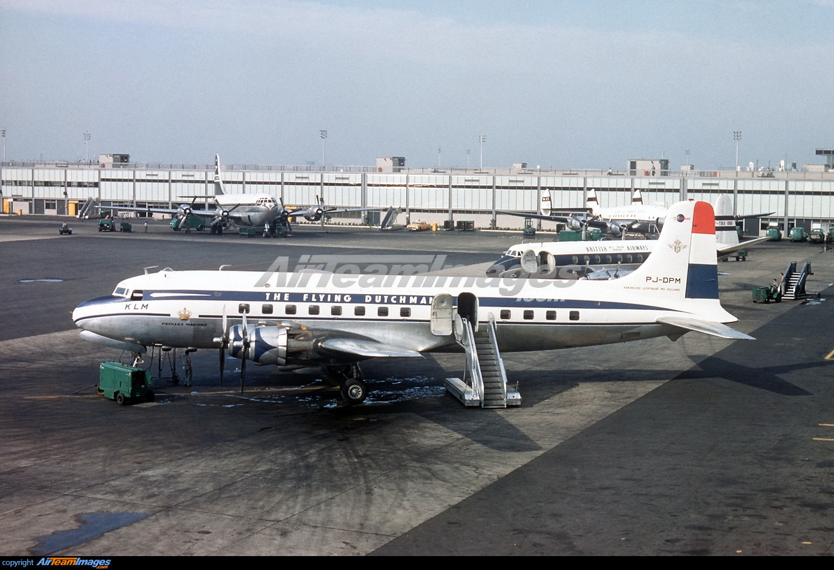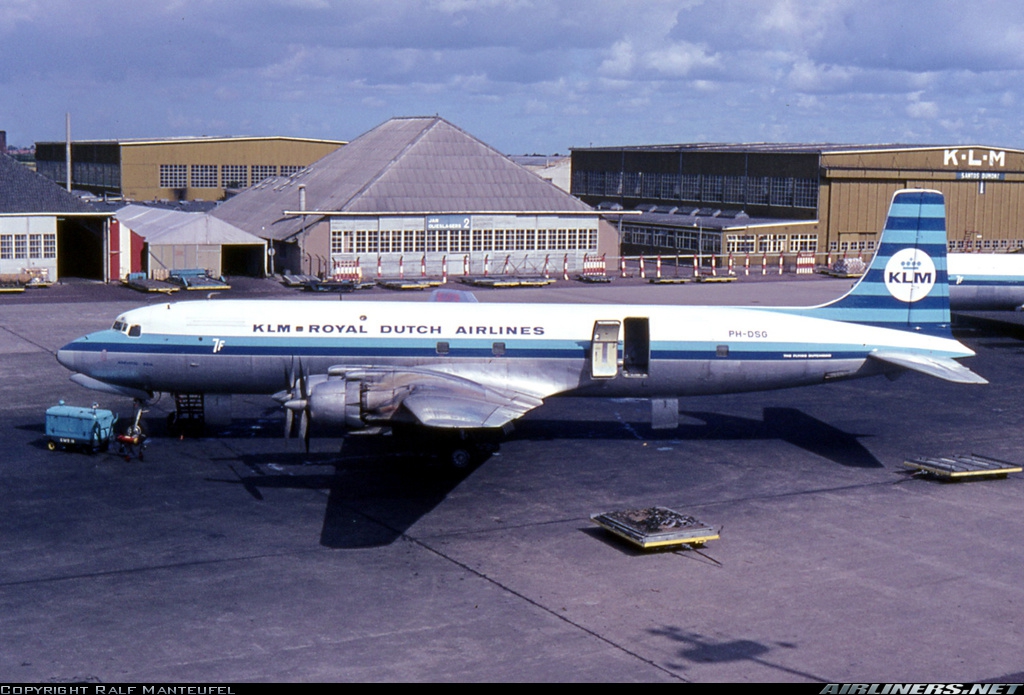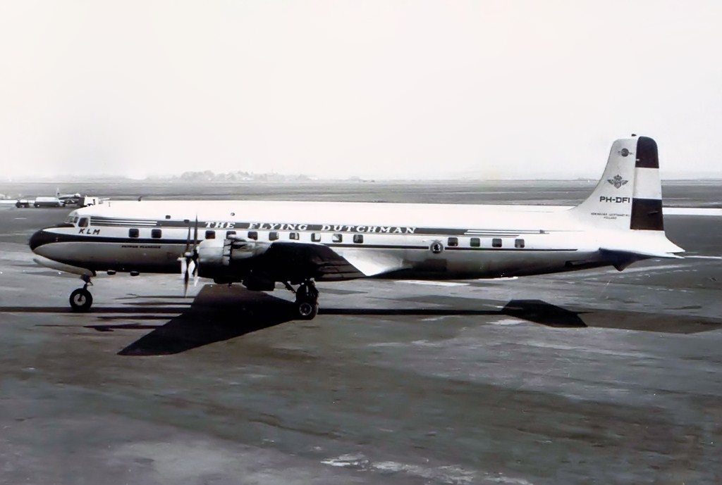 The PH-TAT is one of the six immediately after WII purchased DC 4-1009's, and was delivered in March 1946. With this plane the Amsterdam-New York service was restored. It also had been a number of years in service with the Caribbean subsidiary of KLM as PJ-TAT.In 1954 it got the registration PH DBT. In June 1958 it was sold to Air France. It had two different liveries. In 1954 it had on the left "The Flying Dutchman" and on the right in Dutch "De Vliegende Hollander" on the fuselage. These repaints are part of the download:Douglas DC-4 Dutch Pack for FS2004 and FSX.
