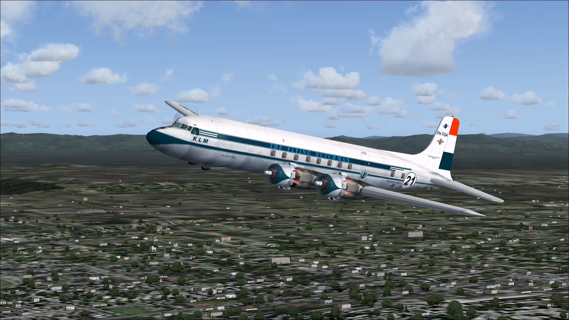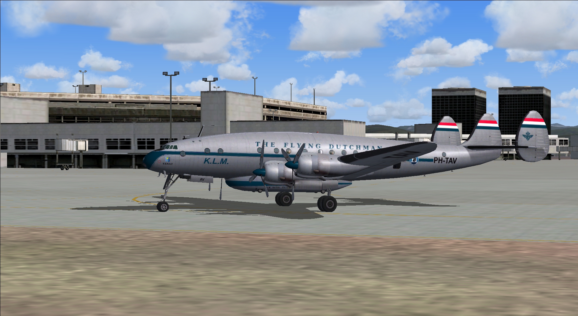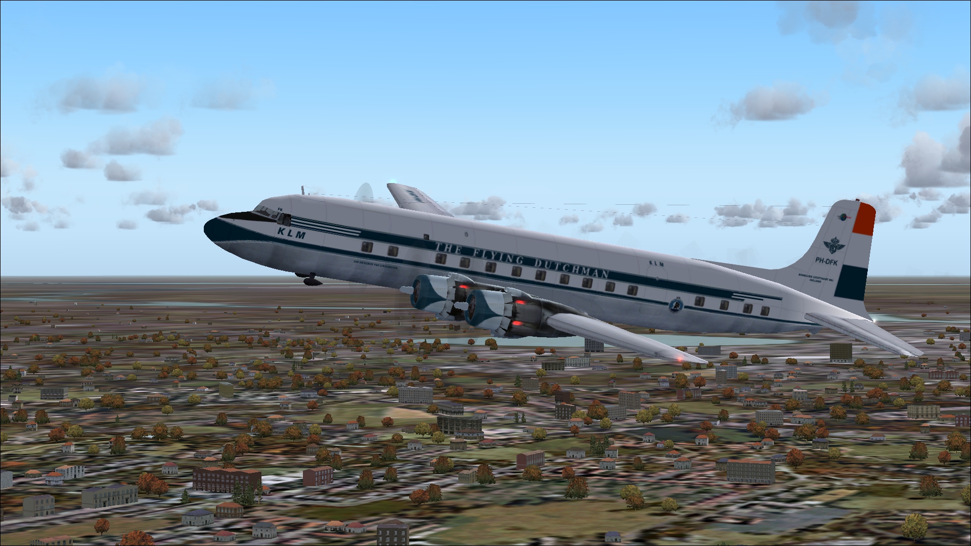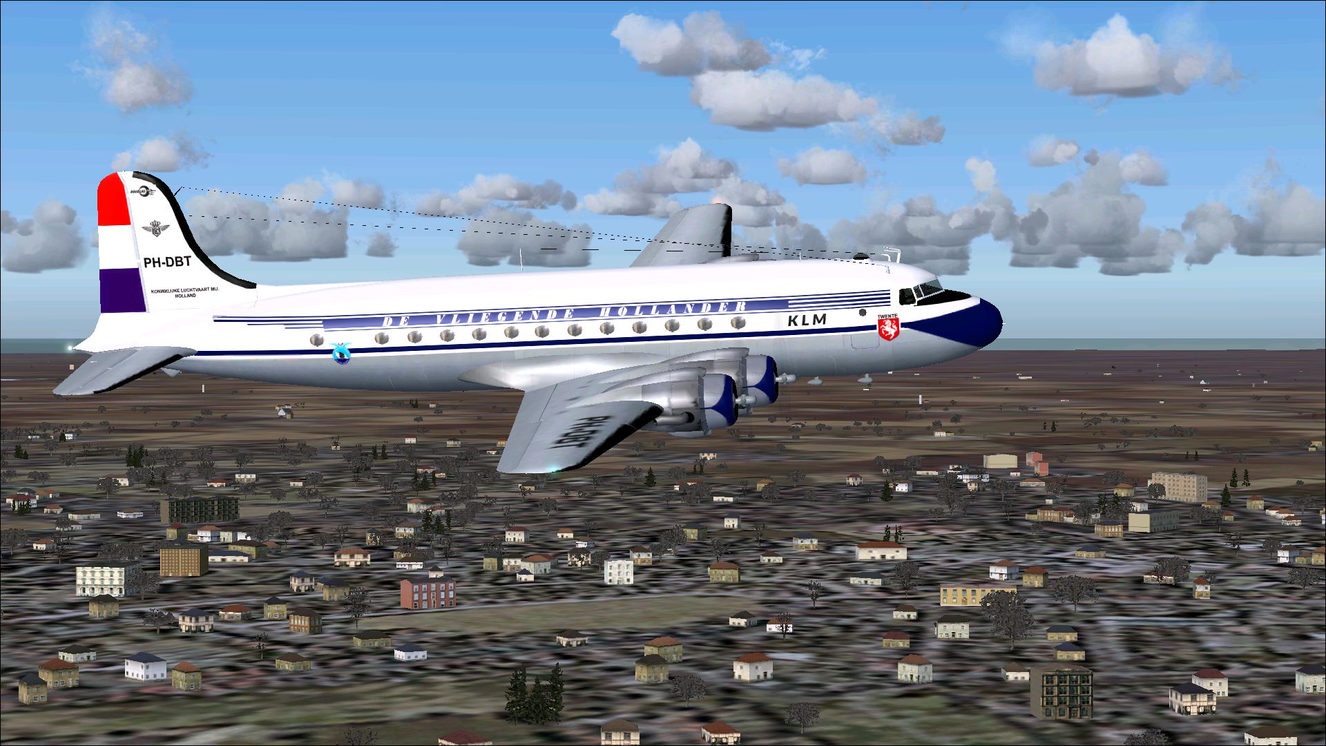 The PH-TAT is one of the six immediately after WII purchased DC 4-1009's, and was delivered in March 1946. With this plane the Amsterdam-New York service was restored. It also had been a number of years in service with the Caribbean subsidiary of KLM as PJ-TAT.In 1954 it got the registration PH DBT. In June 1958 it was sold to Air France. It had two different liveries. In 1954 it had on the left "The Flying Dutchman" and on the right in Dutch "De Vliegende Hollander" on the fuselage. These repaints are part of the download:Douglas DC-4 Dutch Pack for FS2004 and FSX.