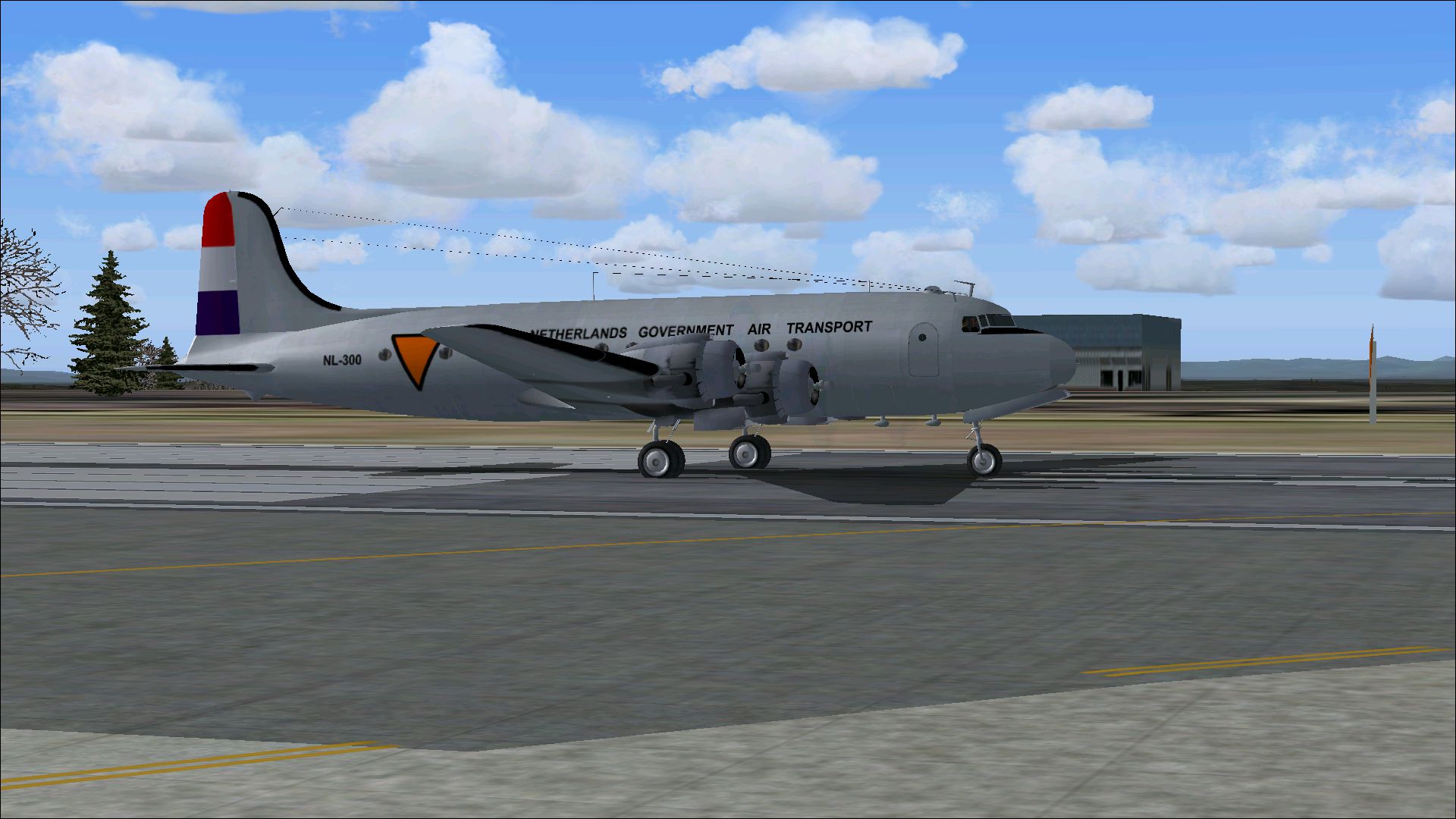During and immediately after the Second World War the transportation by air in the Netherlands was provided by No.. 1316 (English Communications) Flight RAF Transport Command. When this section was terminated its airplanes went to the "Netherlands Government Air Transport" (NGAT). At that time it was not allowed to civil airlines to land at airports along the route. Therefore the Dutch Government performed the routes as a government service. In the autumn of 1945, the Dutch Government hired Douglas C-54 aircraft from the former USAF in order to recover KLM-services. The aircraft were flown by KLM crews, formally employed by the State and were therefore air force uniforms. The machines had an airforce NL-registration, which were repaced in 1947 by the civil PH-registration after the transfer of activities to the KLM . The NL-300 came into service in October 1945 and performed the first flight on 10.11.1945 to the Dutch Indies. Later it became the registration PH-TAB. In October 1947 the aircraft was sold to Skyways in GB. This repaint is part of the download:Douglas DC-4 Dutch Pack for FS2004 and FSX.