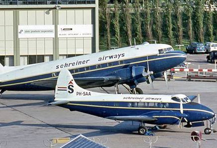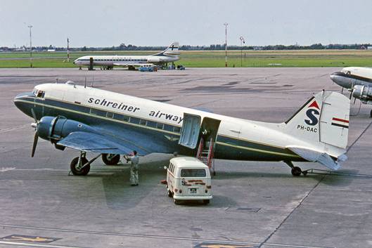 In 1963 Schreiner purchased two Douglas DC-3 Dakotas, actually they were C-47As. The PH-DAC came from KLM and was in service until October 1967 when it was returned to KLM. Schreiner used the aircraft for passenger and freight charters. KLM sold the PH-DAC immediately and then has had a large number of different owners. It was last spotted in Africa in 2004. The PH-ERZ came from the United States where the aircraft was used for VIP transport. Schreiner Aerocontractors became the second civilian owner of this aircraft in March 1963. Schreiner maintained the luxurious VIP interior with 10 seats and offered the aircraft for only Dfl. 2.- per kilometer flown.