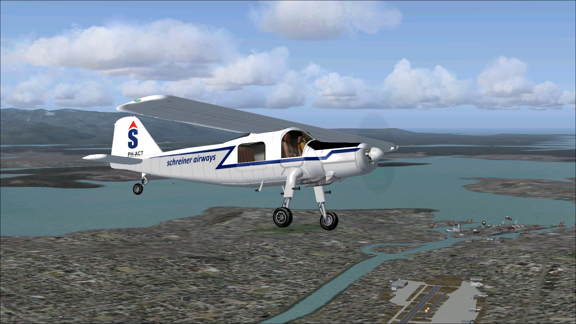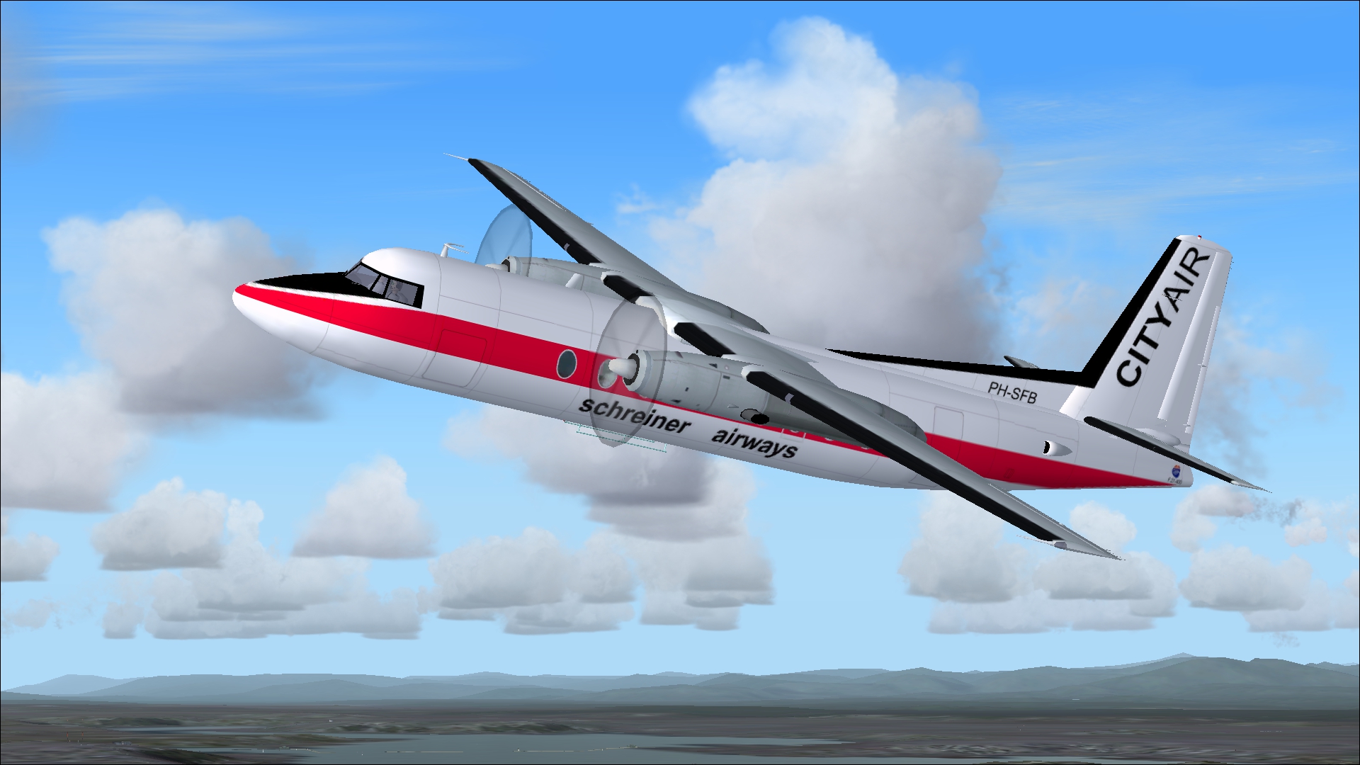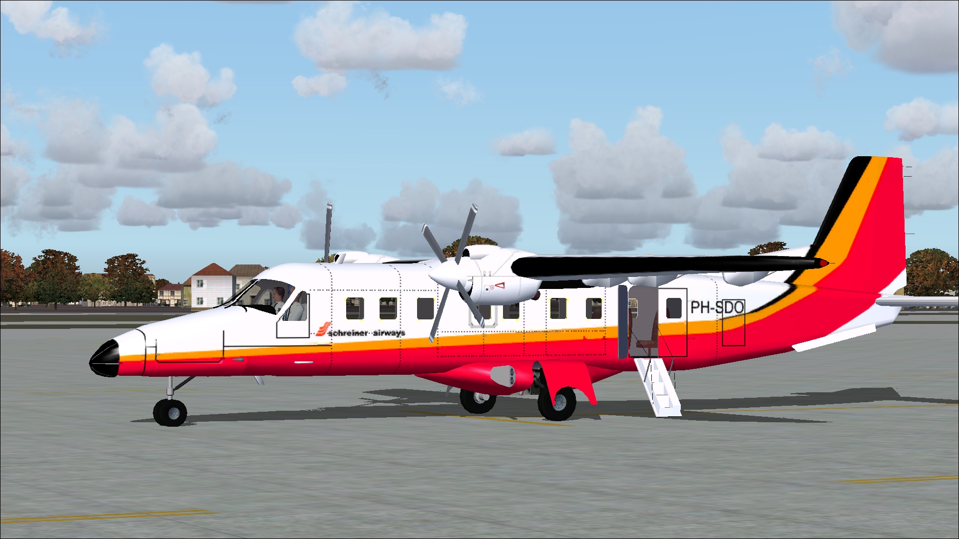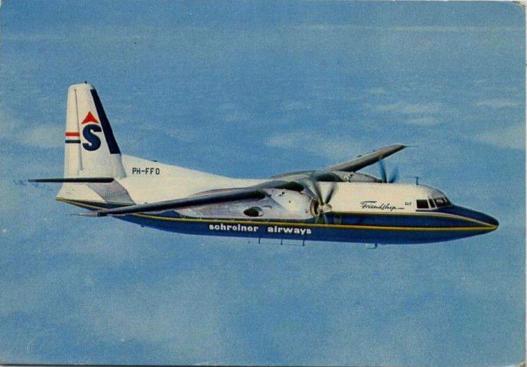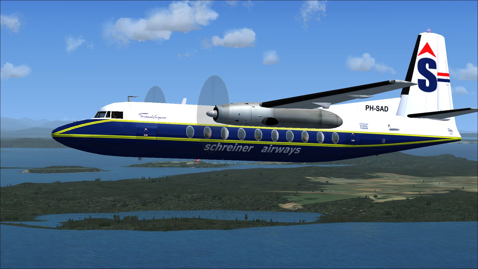 PH-SAD was in Schreiner-service from April 1965 till January 1968.Mainly on charterflights to the Mediterranean. After Schreiner Airways ceased its operations the aircraft was purchased by KLM for its subsidiary NLM. In NLM-service till November 1990. Sold back to Fokker. Fokker leased the aircraft to several airlines till November 1993. Scraped in Argentina in 1996, after it has been in service for 31 years. This repaint is an item within the download: Fokker F 27-100,200,400 Dutch Pack for FS2004 and FSX