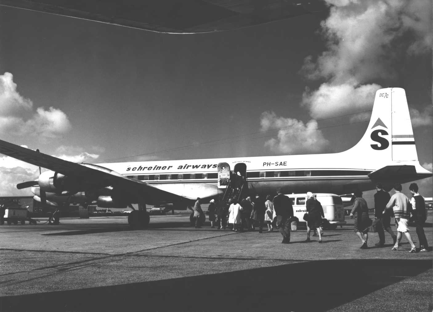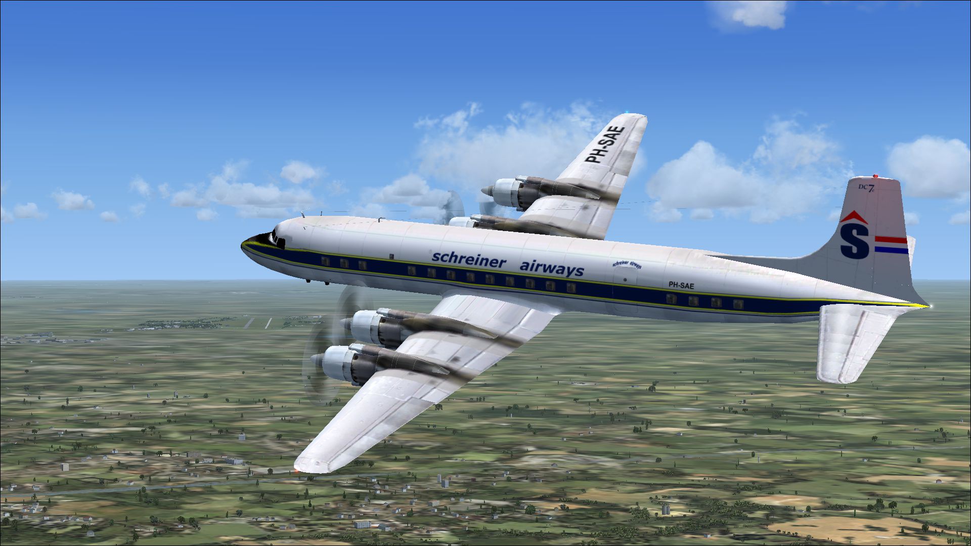 Schreiner Airways leased the DC-7C PH-SAE from Transworld Leasing Ltd. The first owner was Japan Airlines than Braathens of Norway who sold the plane to Trans World Leasing Ltd. From July 1965 until December 1967 in service with Schreiner, untill it ceased its charterflights. Went back to Trans World Leasing and used during the Biafra-Airlift. I have combined all Dutch Douglas DC-7C paint schemes in one download and you can find them on the download page: Douglas DC-7C Dutch Pack repaint only for FS2004 and FSX.