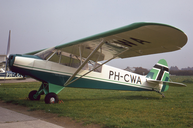 The 1952-built Piper PA-19 Super Cub PH-CWA was built as a Piper L-18B-PI under USAF number 52-2465 and in service with the RNethAF till 1963 with the registrations R-79, 8A-79, 52-2465. After that it went to the RLS(Dutch Government Flight Training School) which modified it to a PA-19. In july 1970 it was bought by Transavia Vliegclub and refurbished and painted in Transavia Holland livery by the Transavia maintenance department. In October 1975 it has been bought by W. van Duin who sold it to the UK in October 1979.