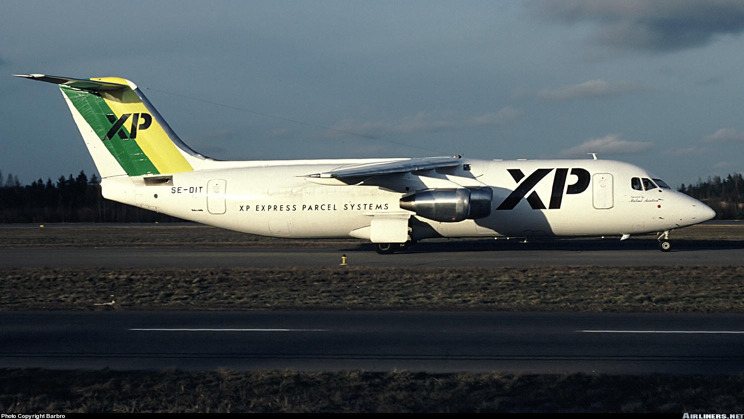 XP Express leased additional capacity from numerous European companies. For the long-term contracts, these leased aircraft, such as this BAe 146-300 of Malmö Aviation, were painted in XP's livery but remained registered in the country of origin.